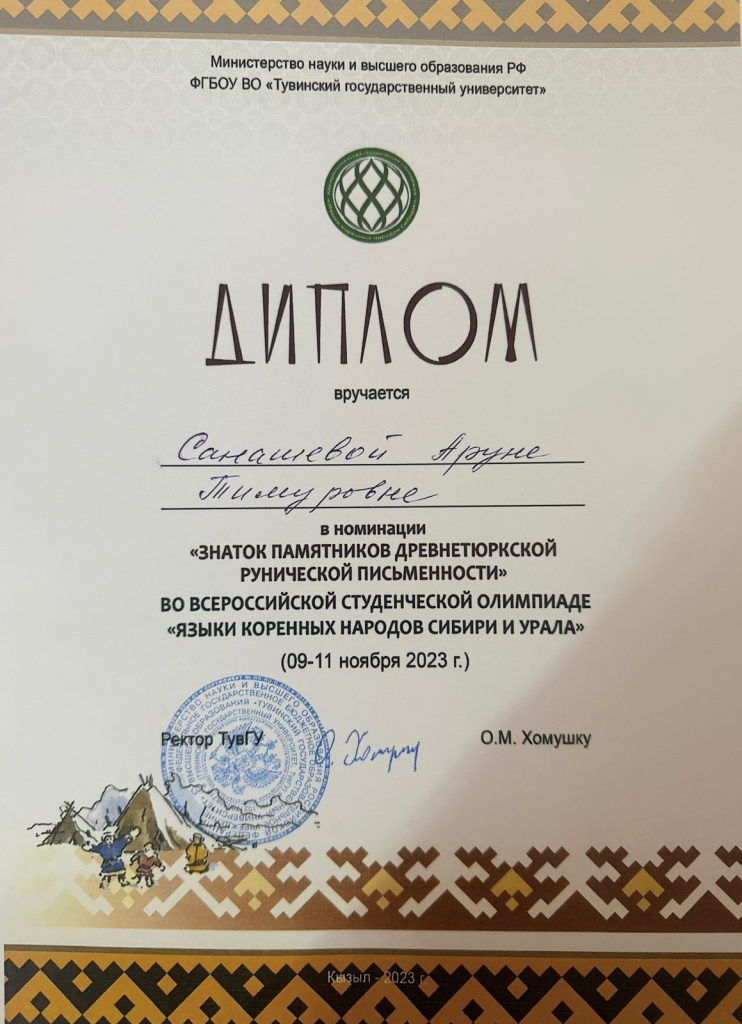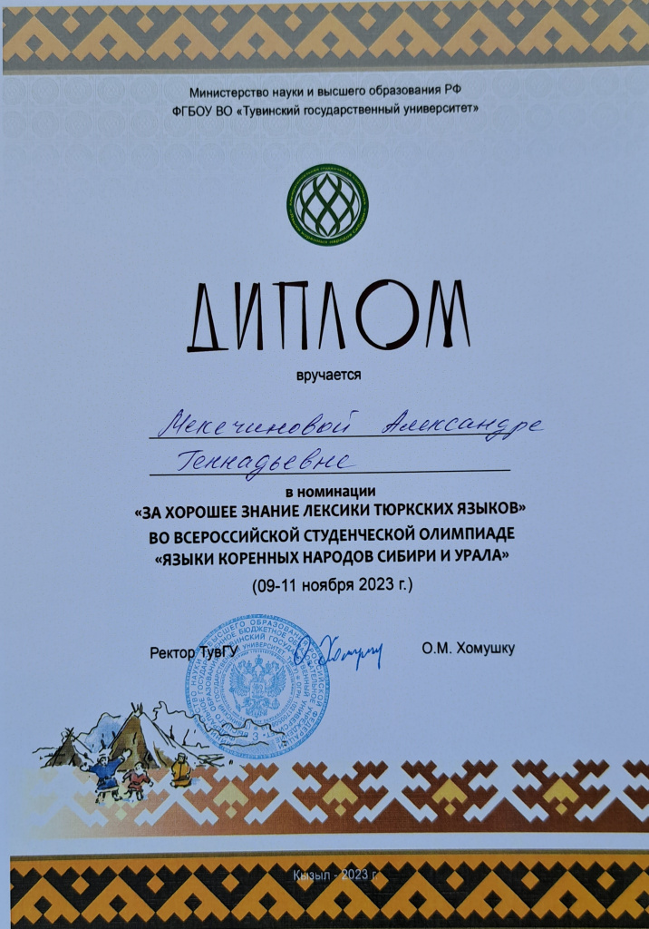 С 9 по 11 ноября в г. Кызыле (Республика Тува) проходила Всероссийская студенческая олимпиада "Языки коренных народов Сибири и Урала". Олимпиада проводилась с целью активизации научного потенциала и взаимодействия студентов различных вузов в области сохранения и развития родных языков, истории и культуры коренных народов Сибири и Урала.